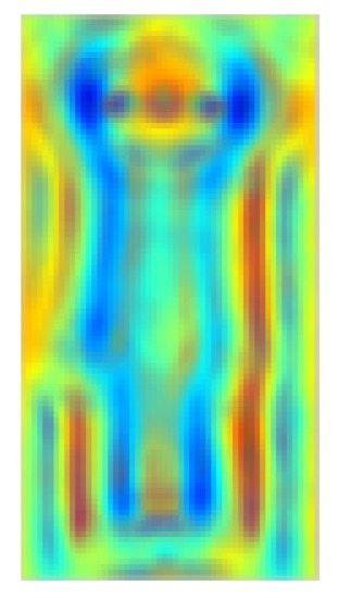The graphical illustration of calculation of R_FHOG features is provided in Figure 6. Figure 7 depicts the positive result by showing R_FHOG (i.e., ) for the segmented object. To speed up the process, we have not considered non-redundant data. Therefore, we have selected region features which give a maximum response on a human region. The formation of the final template from region features considers a value of scale , order , and degree . Template has been shown in Figure 8.
