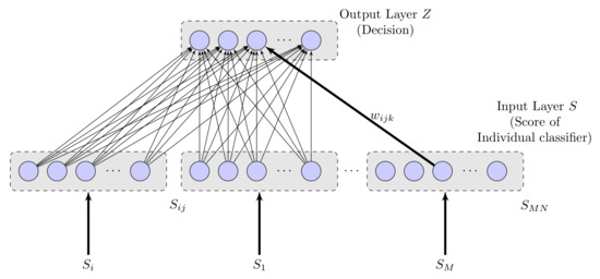 As shown in Figure 10, this neural network organization contains two layers: input layer (S) and output layer (Z) individually. M classifier’s outputs are taken care of corresponding to the input layer and there are N inputs nodes related with the class. The connection between units (/nodes) of the input layer and output layer are between associated by weights w. Each input node gets a score , where i characterizes ith classifier and k characterizes kth class. On the off chance that of input is associated with output node j, the weight of this connection is characterized as . The greatest reaction at the output layer node is characterized as the choice of action recognition.