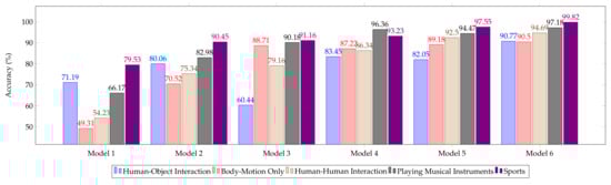 - Kuehne, H.; Jhuang, H.; Stiefelhagen, R.; Serre, T. HMDB51: A large video database for human motion recognition. In Proceedings of the High Performance Computing in Science and Engineering ’12, Barcelona, Spain, 6–13 November 2011; pp. 571–582. [Google Scholar]