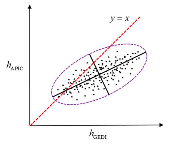 Using the given initial model parameters, the dimension of the vector determined by the GEDI canopy height () and the estimated forest height () can be reduced through principal component analysis []. Therefore, the major axis of the ellipse described by the scattered points cloud (see Figure 1) can be determined by slope k and offset b (i.e., the deviation of the ellipse’s centroid from ). Then, the optimal model parameters and are obtained by continuously adjusting and to make the ellipse’s major axis approach (i.e., establishing a nonlinear least squares objective function with and ), which can be solved by the Newton Gaussian iteration algorithm.