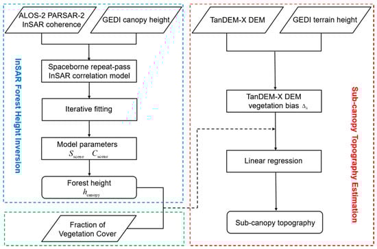 The main purpose of this paper is to investigate whether the TanDEM-X DEM can be used to extract the large-area and fine-resolution sub-topography by removing the forest height signals. The ALOS-2 PARSAR-2 InSAR coherence (APIC) combined with the Global Ecosystem Dynamics Investigation (GEDI) spaceborne lidar data are used to estimate forest height. The TanDEM-X DEM vegetation bias (TDVB) that should be removed is then linked to the forest height and the fraction of vegetation cover (FVC) by a linear regression model. The structure of the rest of this paper is as follows. Section 2 gives a brief introduction to the spaceborne repeat-pass InSAR forest height inversion assisted by the GEDI canopy height. The sub-canopy topography estimation method is then explained. Section 3 validates the proposed method in a tropical forest and a boreal forest. Discussions on the proposed method are presented in Section 4, and some conclusions are drawn in Section 5.