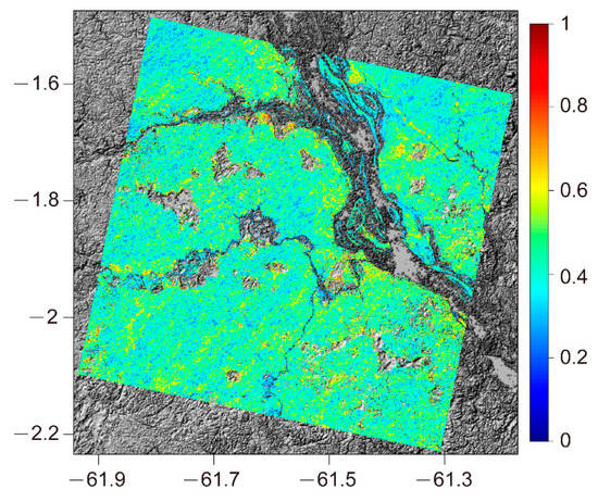 First, the InSAR pair was registered, and the range and azimuth common-band filtering was applied to remove the geometry decorrelation. Next, a multi-look operation of 10 × 5 (azimuth × range) and coherence estimation (5 × 5 window) were applied. Then, the InSAR coherence was geocoded and resampled to a resolution of 30 m, which roughly corresponds to GEDI’s footprint, allowing more straightforward footprint-to-pixel matching. Finally, the non-forest area was masked by the TanDEM-X classification data product []. The average value of the HV-polarization coherence in the forest area is 0.43, and the coherence map is shown in Figure 4.