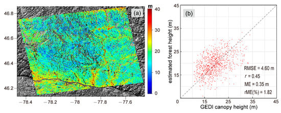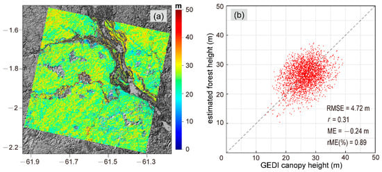 (a) The inverted forest height. (b) Validation plot of estimated forest height versus GEDI canopy height.