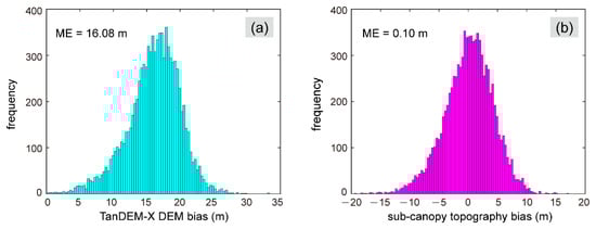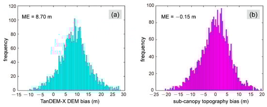 Histograms of the elevation bias: (a) Original TanDEM-X DEM; (b) Sub-canopy topography.