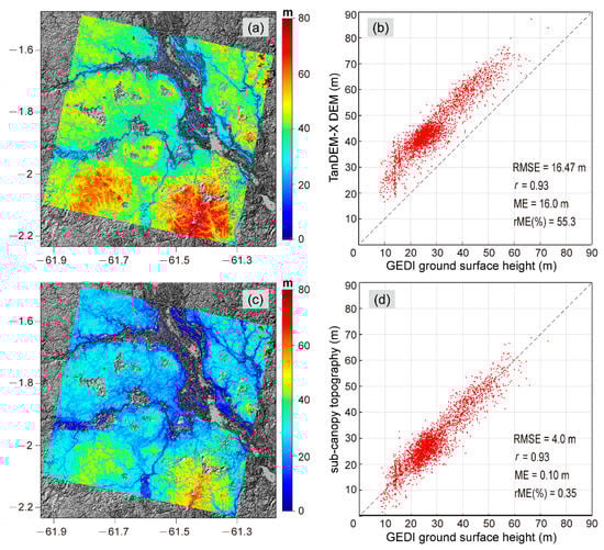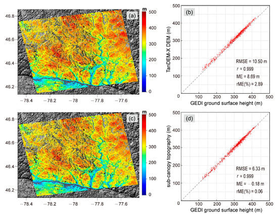 The original TanDEM-X DEM of the entire study area is displayed in Figure 7a. The RMSE and correlation coefficient of the TanDEM-X DEM with respect to the GEDI ground surface elevation were 16.47 m and 0.93, respectively. Figure 7c shows the sub-canopy topography extracted from the TanDEM-X DEM. The sub-canopy topography can reflect the real topography over forest areas, and it was significantly lower than the original TanDEM-X DEM. We also used the GEDI ground surface elevation to evaluate the sub-canopy topography accuracy (Figure 7d). The result presents significant improvement with an RMSE of 4.0 m.
