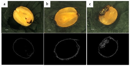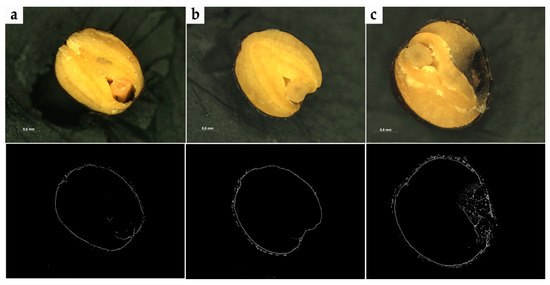 Examples of images that present rapeseed trials: (a)—rapeseed free of contamination with initial moisture content of about 6%, (b)—contaminated rape seeds stored in conditions characterized by 12% seed moisture content and at a temperature of 25 °C, (c)—contaminated rapeseed stored in conditions characterized by 12% seed moisture content and at a temperature of 30 °C.