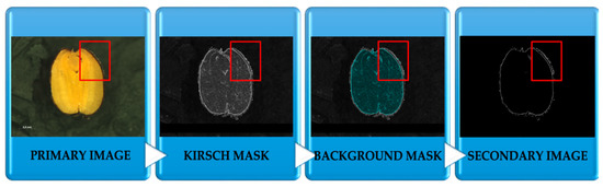 Another stage of the research required the preparation of ANN for the learning process, in this case, samples of rapeseed in the form of numerical data were used. In order to this, the MatLab environment and original software “PID system” were used. The first step required adaptation of the rapeseed sample in such a way to determine its features, i.e., the important standard of a digital image. Figure 3 shows stages of creating a standard from an image in order to isolate only fungi contamination in the rapeseed sample. Using the “PID system” in image processing and analysis in order to create the original image, which was acquired with digital microscopy, a filtration was carried out based on the maximum gradient with a Kirsch mask [35]. The Kirsch compass mask is used to attribute maximum magnitude to the central element with filtration of eight masks rotated to each other at 45 degrees [36]. In another stage, the cutting of the background inside the rapeseed sample was carried out. In order to do this, it was necessary to prepare the original script in MatLab supporting this way of cutting out image fragments. Secondary images were extracted to descriptors of image texture thanks to the use of the original software “PID system” with the module of batch image processing. The “PID system” allows for the extraction of image descriptors and the use of various operations on an image, including segmentation, filtration, and making masks (for example Laws’ masks) [19,37]. It needs to be added that the Gray-Level Co-occurrence Matrices (GLCM) matrix algorithm was used in the research in order to isolate descriptors of secondary images [19,38,39]. The aim was to achieve a better visual effect of substantial details for secondary images that were created. Rapeseed including pathogens, which are graphic objects, are very difficult to visualize because of their tiny size. The application of this technique allowed for fast, non-invasive isolation of details from an image on the basis of pixels with determined values appearing in an image. The “PID system” software together with the MatLab environment allowed for the creation of a learning set (file with cry extension) including 520 learning cases received from secondary images. Each case included 18 selected descriptors of image texture [38].