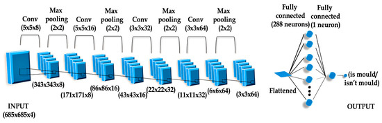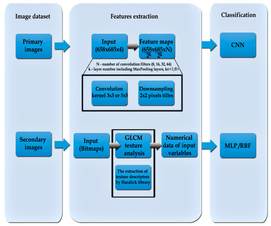 Within the scope of the research, networks were prepared on the basis of data characteristics for a given network type: MLP/RBF and CNN. The first method of designing a network was based on preparing a learning set Z1 in order to determine numerical data of texture from a secondary image. The process of acquiring data was carried out by image processing and analysis with the “PID system” and MatLab. As a result of the above procedure, 18 representative features of an image were obtained (variables such as angular second moment, contrast, correlation, sum of square variance, inverse difference moment pairs of pixels, sum of average pairs of pixels, sum of variance, entropy, difference variance, difference entropy, and info. The measure of correlation one and two, cluster prominence, cluster shade, dissimilarity, homogeneity, maximum probability, and inverse difference normalized) on the basis of GLCM matrix for each learning (secondary) [23,38,40,41,42,43]. The second method of designing a network was based on determining descriptors (secondary images) together with information determining fungi contamination of rapeseed, which were used to build up convolutional neural networks as input variables for learning set Z2. In order to improve the effectiveness of recognizing the primary image on the first stage, a rotation and image cutting with Python coding was carried out as well as the modification of images (moving and zooming, each time with random values) from the learning set individually for each sample before each learning session. Thanks to these operations, the model that was trained received slightly different images created from the same primary samples belonging to the learning set, which each learning session. After building learning set Z2, image convolution was used, from which a map of features with determined shape (width, height, and channels) was acquired from the microscopic image (primary image) with selected resolution. Each image pixel was assigned to model value “RGBA”. The structure of the devised CNN network included (Figure 4):
