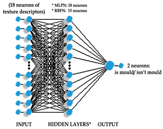 Currently, one of the most modern techniques of image processing [19,20] and image classification [21,22] in decision-making processes is the use of artificial intelligence methods [23,24]. In recent years, artificial neural networks have become so popular and effective that they started to be used in various problematic areas, among other things, in the optimization of food processes [25]. On account of the complexity of neural network processes supporting, among other things, visualization techniques [26], a proper formulation of decision-making problems is required, hence, it is possible to solve given problems. For the last couple years, Artificial Neural Networks (ANN) have been supported by Convolutional Neural Networks (CNN) [27,28,29]. The difference depends on the interpretation of network of input variables, in this case, images. The traditional technique of learning with ANN takes place by selecting, among other things, adequate parameters (descriptors) indicated in an image with previously carried out processing functions, filtration, edge detection, and texture, and with the use of learning algorithms such as the fastest neighbor method, Kohonen’s method, and the K-average method. Image pixels [30,31] are exclusively responsible for the parameter determining the input variables in CNN and the learning process of those networks requires the processing of more than two hidden layers (the so-called multi-layer learning directly from the input to output layer). In view of the above, in CNN networks it is not required to isolate the given functions from images before the learning process, as it takes place with machine learning [21]. In the literature, it is now observed that CNN networks substantially increase classification effectiveness in comparison with traditional methods of machine learning [32]. In view of the above, the research made a comparison of the effectiveness of detecting rapeseed affected by mold between Multi-Layer Perceptron (MLP), Radial Basis Function (RBF), and CNN networks.