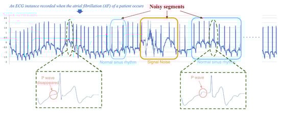 Figure 1. An example of a health-condition monitoring record with noisy segments whose label is Atrial Fibrillation. - Interpretability of prediction results: Most existing deep-learning-based methods are often regarded as black-box models, as they can only output a specific diagnosis result without necessary interpretability. Nevertheless, in the real-life scenario of health-condition assessment, to realize “why” is, for the most part, more important. To explain the results of Deep Neural Network (DNN) models, most methods use the attention mechanism to highlight segments of an input record which are strongly associated with the model prediction and consider them as an explanation of prediction results [,], while others measure the role of each feature in the prediction process [,]. However, these kinds of highlighted segments and exploration of feature effects can only provide auxiliary information, which cannot be a decision-making basis actually, as they cannot provide domain technological proofs. For instance, to achieve a sound balance between the best commercial and safety decision-making carefully, airlines may require detailed technological information on why the flight plan of an aircraft has to be suspended immediately. Thus, interpretable explanations of the model must be technological proofs with admissive knowledge which can be widely accepted by domain experts.