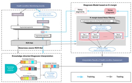 A K-margin-based interpretable learning method is presented to solve the above difficulties. Specifically, a skewness-aware RCR-Net approach (Section 2.2) is presented to alleviate the problem of class imbalance. In addition, to tackle noise, a K-margin based diagnosis model (Section 2.3) is proposed, which can automatically focus on the most important segments and involve only part of the labeled segments in the skewness-aware RCR-Net learning process. Finally, a knowledge-directed diagnosis interpretation model is employed to extract features that can be regarded as important domain knowledge. The framework of our model is shown in Figure 2.