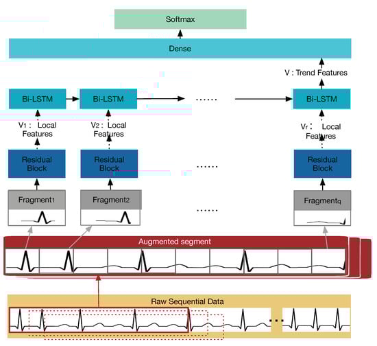 Additionally, a multi-view RCR-Net is presented to establish a general deep learning model, which can automatically obtain features for a wide range of health conditions. Specifically, it consists of 33 layers of residual blocks [], one layer of recurrent block, and one layer of a fully connected block. The purpose of using residual blocks is to construct a deeper model through the residual connection between blocks, and automatically extract more effective local morphological-level features. To capture potential trend-level features in monitoring data, a recurrent layer with Bi-directional Long-Short Term Memory (Bi-LSTM) cells is employed. Finally, the prediction is made by a fully connected layer and a softmax layer. The cross-entropy loss of the objective function is calculated to optimize the loss of the training neural network.