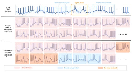 - Noisy segments: Most methods employ noise elimination approaches (e.g., grey spectral noise estimation [], Dense Neural Network + spectrum-based noise elimination [], CNN + Kalman filter [], Encoder–Decoder [], etc.) to denoise health-condition monitoring data, but they cannot deal with all of the noisy segments effectively, as the noisy segments refer to not only signal noise, but also the segments containing noisy labels. Taking a real-world electrocardiograph (ECG) record which is shown in Figure 1 as an example, its reference health-condition label given by cardiologists is ‘Atrial Fibrillation’. However, it may still contain some other types of segments (e.g., Normal sinus rhythm, etc.). Different from the irregular changes of the amplitude of segments with signal noises in the frequency domain or non-periodic variation in the time domain, only very subtle key differences in the segments that contain noisy labels can be found. For example, as shown in Figure 1, the morphological features of segments containing the noisy label of ‘Normal sinus rhythm’ are very similar to that containing only the ground-truth label of ‘Atrial fibrillation’, except that a ‘P wave’ only appears in the waveform of segments that contain the noisy label of ‘Normal sinus rhythm’. However, the traditional noise elimination methods cannot effectively deal with these segments with noisy labels which are very similar to that containing only reference labels in morphological features. Furthermore, in the field of health-condition assessment, the accuracy of the model may be greatly reduced when a monitoring record contains too many noises, and thus it may lead to sudden death, air crash, and other tragic events due to the misdiagnosis. Therefore, in addition to accurate health-condition detection from the good-quality monitoring data, automatic recognition of low-quality noisy signals is required as well to remind domain experts to intervene in time. Nevertheless, the use of noise elimination methods may affect the accuracy of the detection of low-quality noisy signals, as it may cause changes or losses of features representing the quality of the monitoring signal itself.