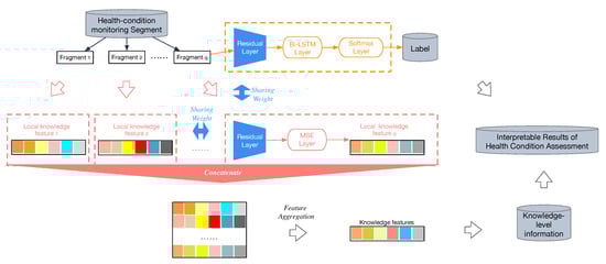 The architecture of the knowledge-directed interpretation method is shown in Figure 5. The health-condition predictor is shown in the orange dashed box, which trains a multi-view RCR-Net for health-condition classification. The red one is a knowledge-level feature extraction step, which shares weights with the Residual layer of health-condition predictor, and then replaces the Bi-LSTM layer and Softmax layer with a Mean square error loss (MSE) layer to form a knowledge-level feature extractor.