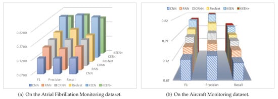 It is clear from the diagrams in Figure 6a that the precision, recall, and scores of the KEEN and KEEN+ are better than all the state-of-the-art deep learning methods in the task of atrial fibrillation diagnosis. The methods of CNN, RNN, RCNN, and RESNET are not effective, mainly due to the high noise contamination in this data set, and such methods do not deal with the problem of noisy segments. The method of ResNet works better mainly because of deeper networks. However, it is limited by the ability of model expression of the first three methods to build very deep networks, which may lead to the information loss and feature loss.