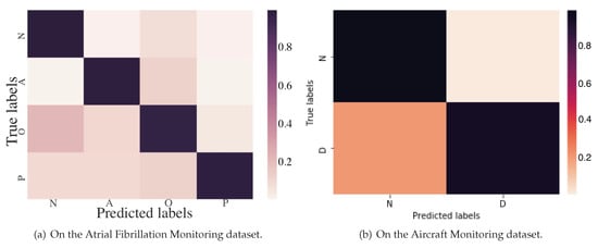 - Thorough experiments are carried out on Atrial Fibrillation Monitoring dataset [] and Structural Damage Monitoring Dataset []. The experimental results demonstrate that the proposed method with 0.7974 and 0.8005 scores, respectively, which outperform all state-of-the-art deep learning methods for health-condition assessment tasks by and .