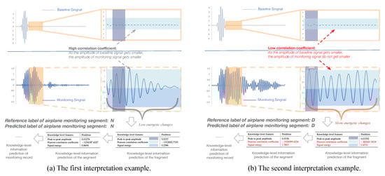The reference label and predicted label of the input aircraft monitoring segment shown in the first example are both “N”, while the reference label and predicted label are both “D” in the second example. Compared with the second example as shown in Figure 9b, the amplitude of monitoring signal in the first example (as shown in Figure 9a) decreases significantly, which is much more similar to the baseline signal, while the second one shows an even stronger amplitude variation which reflects higher signal energetic changes. The results indicate that the second example has a much lower Pearson correlation coefficient (measuring the correlation of amplitude variations between baseline signal and the monitoring signal) and higher signal energy (measuring the changes of energy), which meets the diagnostic criteria in aircraft structural damage.