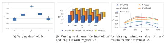 To evaluate the effect of different hyper-parameter settings on the performance of our method, four main hyper-parameters (threshold K, window size , maximum stride threshold , and length of each fragment ) are further evaluated.