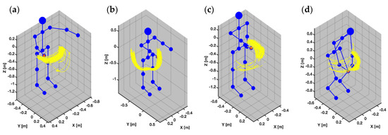 Depicts in blue the action component order for the participant performing the 4 movement tasks during the sensor validation protocol. Illustrated in yellow the OptiTrack reflective marker movement path associated with each movement task. Depicted in blue is a handcrafted skeleton used to establish a spatial reference. From top to bottom, the 4 movement tasks are: (a) Horizontal Arm Movement, (b) Vertical Arm Movement, (c) Rotational Arm Movement, and (d) Composite Cross-Body Movement.