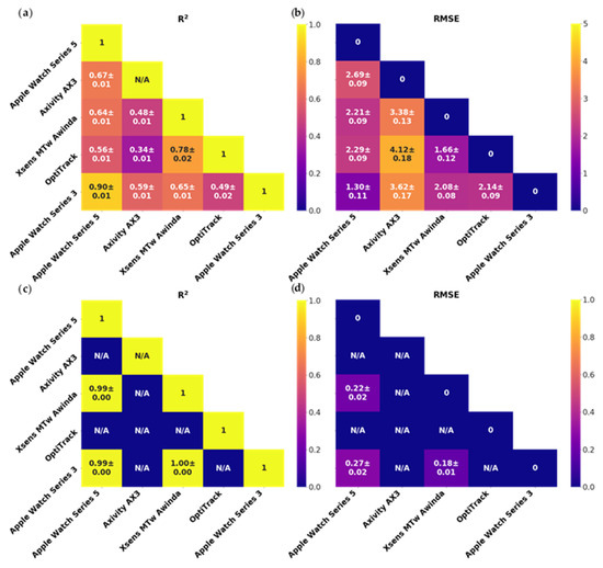 Triangle diagrams of the sensor validation study aggregated by pairwise signal measures (R2 for dynamic tracking of signals and RMSE metrics for offsets) between the selected motion sensors (Apple Watch Series 3 and 5, Xsens, Axivity, and Optitrack). Data is organised in (a) linear acceleration R2, (b) linear acceleration RMSE (m·s−2), (c) angular velocity R2, and (d) angular velocity RMSE (rad·s−1). Displayed R2 and RMSE values in the figure are rounded.