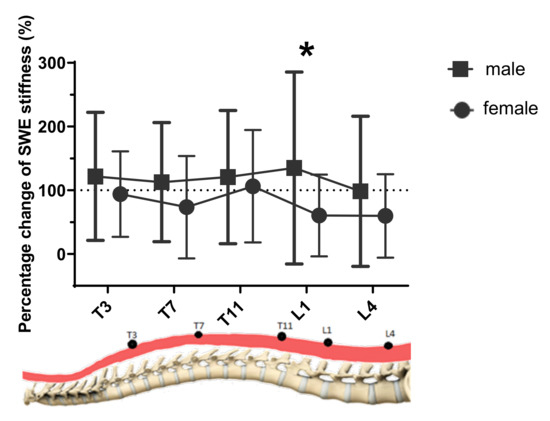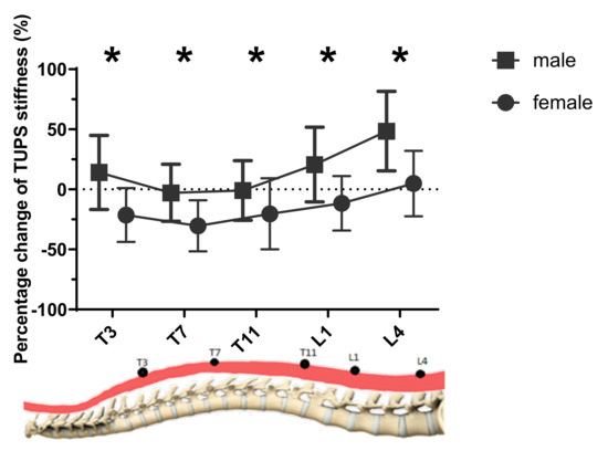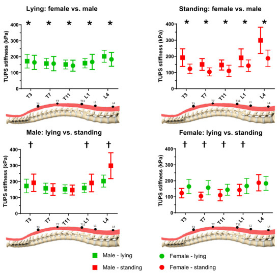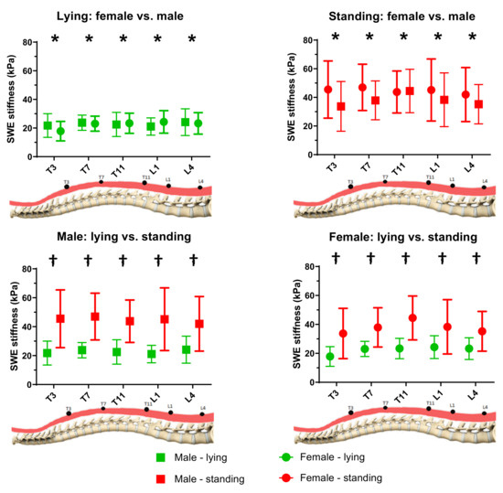 | L4 | 24.1 ± 9.3 † | 23.3 ± 7.5 † | 42.0 ± 18.9 † | 35.2 ± 13.7 † | Gender * level * posture: 0.360 | 0.017 |