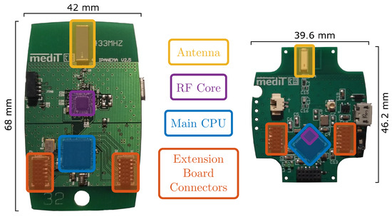 Comparison of the board layouts of the Integrated Posture and Activity Network by MedIT Aachen (IPANEMA) v2.5 (left) and v3.0 mainboards (right). The most important components are color-coded for each board.
