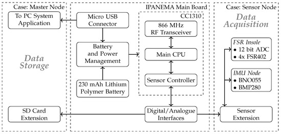 For communicating with the sensor boards, the SC provides different standard interfaces such as the Inter-Integrated Circuit () bus, the Inter-IC Sound () bus, the Serial Peripheral Interface (SPI), and the Universal Asynchronous Receiver Transmitter (UART) bus. It also contains an integrated 12-bit Analog-to-Digital Converter (ADC), several interrupt functions, comparators, and counting modules to interact with measurement circuits. The sampling rate can be adapted individually for each different sensor modality within the SC configuration. The SC and the main CPU share a dedicated memory space to exchange data to be further processed and sent over the network. The main CPU organizes the communication following the proprietary network protocol. Sensor data are retrieved from the shared memory and transmitted in network packets. The data are received by the master node and either forwarded to a PC system via a USB port or stored on an integrated micro SD card for long-term monitoring purposes. For telehealth applications, the data are additionally transferred to large-scale memory servers for further processing the obtained data. A graphical overview of the system is given in Figure 2.