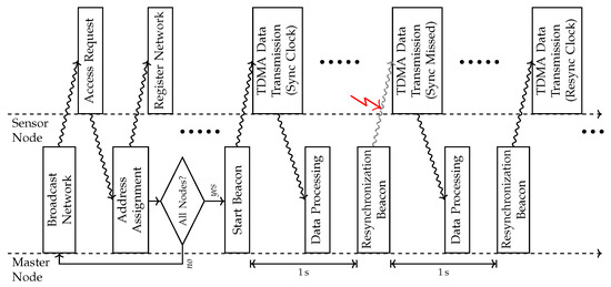 The IPANEMA BSN consists of a master node (MN) and several sensor nodes (SNs) that are organized in a star-shaped network. The proprietary internal network protocol is based on this topology. The MN initializes the network structure for a predefined maximum number of SNs connecting to the MN. The communication is controlled by a time division multiple access (TDMA) process that assigns dedicated time slots to each SN connected. A higher-level communication frame allows for periodical re-synchronization of the SNs and network error handling by the MN. For this purpose, the MN sends re-synchronization beacons each second and eventually reconnects lost SNs. In this case, a careful re-synchronization is not only necessary to comply with the dedicated time slots of the TDMA protocol, but additionally, ensure an accurate time-stamping of a single sampling point for any sensing modality. After each SN has registered and received its individual unique network ID, the MN broadcasts the start beacon initiating the TDMA protocol on all nodes (Figure 3).
