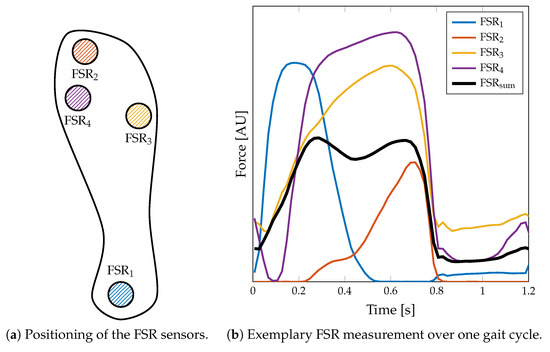Implementation of the force sensing resistor (FSR) insole. (a) The insole is equipped with four FSR402 sensor pads located at the distal phalanges (), the first () and the fifth metatarsophalangeal joints (), and the heel (). (b) An exemplary measurement of a step with this sensor setup. Note that the does not reflect the actual force, since the setup is not calibrated to the individual pressure distribution.