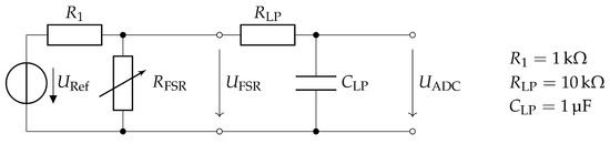 Each FSR sensor is part of a voltage divider supplied by the reference voltage (Figure 5). The resulting signal is filtered by a low-pass circuit with a corner frequency of and subsequently sampled by the 12-bit Analog-to-Digital Converter (ADC) MCP3204 (Microchip Technology Inc.). The ADC is connected to the sensor controller via the SPI bus.