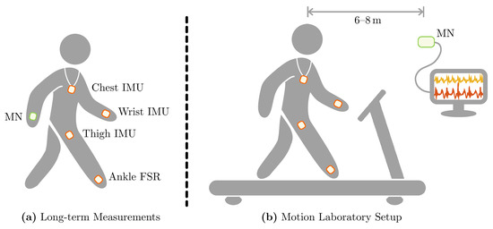 Smart electronic devices, i.e., mobile phones and smart-watches, and their integrated sensor units offer a promising opportunity to unobtrusively collect motion data. Concerning the fundamental idea of an unobtrusive sensor setup for everyday-life monitoring, we chose a setup including three IMU sensors, attached to the thigh, the wrist, and the chest as well as one FSR insole. This setup is motivated by typical wearable devices and their preferable wearing location: A cell phone in the pocket (thigh) and a smart-watch at the wrist supplemented by a pendant sensor for fall detection (cf. Philips Lifeline AutoAlert or similar) and an ordinary insole. With this sensor setup, we ensure on the one hand a broad acceptance for wearing these sensors and on the other hand cover movements of the lower extremities, the trunk, the upper extremities, and the ground contact. The typical applications are twofold. On the one hand, it is possible to conduct long-term measurements with the MN directly attached to the human body, in our case at the second wrist. On the other hand, the BSN can be used to record data in a motion laboratory environment, where the MN is connected to a PC system to enable online tracking of the data streams. The two application scenarios are depicted in Figure 6 showing the individual sensor locations for each case. Please note that in the motion laboratory the distance between MN and the participant walking on the treadmill was approximately 6–8 m due to infrastructural constraints.