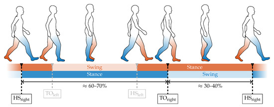 The most important characteristic points for wearable-based gait analysis are the heel strike (HS) and toe off (TO) events, respectively. These events indicate the two main phases in human gait, the stance phase, and the swing phase (Figure 7) and usually represent prominent and, therefore, easily detectable landmarks in wearable sensor data. Therefore, they are commonly used as key features in gait segmentation. Based on the specific application, other key features such as mid swing or mid stance can also be detected in wearable-based data. Since the FSR-based gait segmentation is in the main scope of this contribution we focus on the detection of HS and TO events. The summed-up FSR time series serves as the input signal for the segmentation algorithm. Since insole-integrated FSR measurements besides GRF are subject to additional motion artifacts due to contact pressure of the shoe and, therefore, differ from standard GRF measurements (i.e., force plate), we implemented a specific algorithm for HS and TO detection in FSR data.