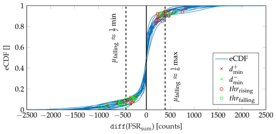 Firstly, we calculate the local minimum of the summed-up FSR signal, which corresponds to the lowest pressure during one gait cycle. Since in higher walking speeds the plateau of the maximum foot pressure alters to a double peak due to the swing phase initiation of the opposite leg (cf. Figure 4b), the maximum peak pressure is not a reliable indicator. We assume a minimum distance of between two adjacent peaks for the parameterization of the peak detection. Then, we identify the beginning of the falling (TO) and the rising edge (HS), respectively, starting from the local minimum. Therefore, we find the closest positive and negative value exceeding certain threshold values in the approximated derivative (diff()) of the summed-up FSR signal. These thresholds values were determined based on the FSR measurements conducted during the walking trials related to this contribution. Therefore, we investigated the empirical cumulative distribution function (eCDF) of the single difference signals of the summed-up FSR data. As shown in Figure 8, the eCDF can be separated in three main parts: a flat distribution region of negative signal slope, a relatively small transition region, and a flat region indicating positive slopes. This characteristic is mainly due to the signal shape of a band-limited rectangular signal. We identified the key characteristic points of the eCDFs, which we defined as the turning points from negative slope flat since these points statistically separate falling and rising edges from signal plateaus. For every single normalized eCDF, we identified the turning points by searching the minimum distance between the eCDF curve and for and for , respectively. Subsequently, we calculated the mean value of the normalized amplitudes to define a fixed threshold with respect to the maximum and minimum amplitude values of each eCDF. Due to computational reasons we rounded the values to integer fractions.
