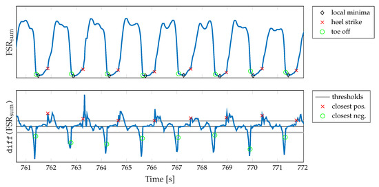 The basic procedure of identifying the threshold values is depicted in Figure 8. In addition, the final threshold values and according to Equations (9) and (10) are given. Finally, an exemplary illustration of the FSR-based gait segmentation algorithm is shown in Figure 9.