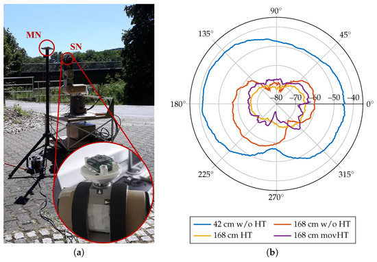 The technical evaluation measurements include recordings of RSSI at an increasing distance with varying transmission power output in a laboratory environment, where the antennas of both sender (SN) and receiver (MN) have been aligned accordingly. As expected according to theoretical considerations following the free-space path loss, the RSSI decreases with increasing distance and decreasing transmission power output. Here, also the transmission output power, matching network loss, and antenna gain are included in the measurement results, which results in an overall offset of approximately . In a second experiment, the RSSI was recorded from different spatial angles in a free-space environment, where the sensor node was placed on a turnable end-effector of a robot arm (Figure 10). During the measurement, the sensor node was rotated by 360 in the x-y-plane. The receive signal quality was recorded by the master node that was placed at varying distances (Figure 10b).