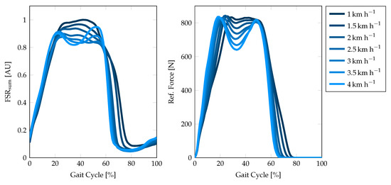 To validate the reproducibility of GRF by the FSR insole, we conducted a clinical trial study with 10 healthy, young participants, who volunteered in a treadmill walking trial. The subjects walked on the treadmill for 7 min per trial at increasing speeds from 1–4 . Each speed step was kept constant for one minute and increased by in between by the trial advisor. The treadmill included integrated force sensors underneath the walking plane, which was used to generate the reference data. The force data from the treadmill can be integrated over the 2D foot area to obtain the vertical GRF of the corresponding gait cycle. Gait cycles within the reference force can be easily detected by thresholding the signal with the smallest possible threshold since the force plate yields zero force during the swing phase. The recorded FSR signal is separated using the algorithm presented in Section 2.7. To analyze the qualitative reproducibility, we averaged over all gait cycles at one speed step for both summed-up FSR and reference force signal. A visual comparison of the FSR measurement and the reference force is depicted in Figure 11.