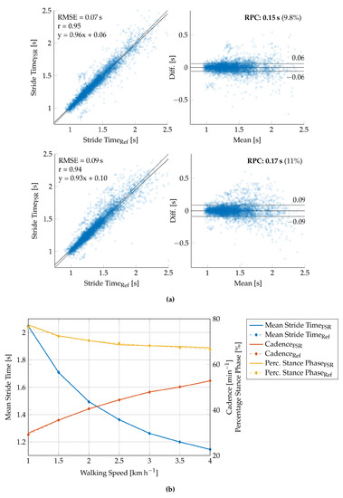 Validation results of the speed-related gait parameters. (a) Correlation (left) and Bland–Altman (right) plot for the HS-based stride time extraction (above) and the TO-based stride time extraction (below) for all strides detected during walking trials. (b) Graphical representation of the overall extraction performance with regard to the calculation of the mean stride time, the cadence, and the percentage stance phase (cf. Table 6).