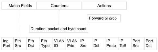 Figure 2 shows the structure of a flow rule. It is mainly composed of three parts: match fields, counters, and actions. Unlike traditional networks that perform forwarding based on the destination addresses, match fields are determined by the configuration of the forwarding application and might be ingress port, VLAN ID, source and/or destination MAC addresses, IP addresses, and/or port numbers. Counters keep track of the duration of the flow and byte and packet counts that matched the flow. The action can be forwarding the packet to the specified port or dropping it, among others.