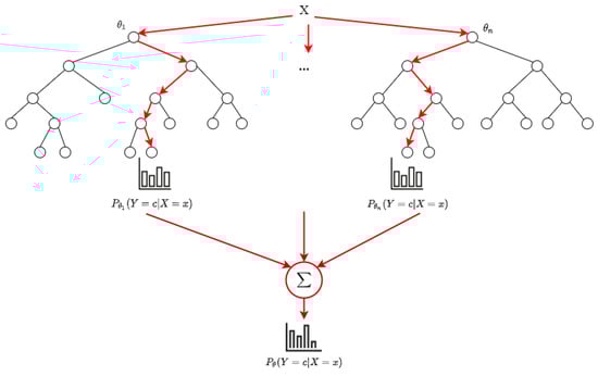 Figure 4 shows a simplified view of classification by random forests. Here, the child branches of the root show the different trees in the random forest. When a data item X needs to be classified, its probability of belonging to class c is calculated as the sum of the class probabilities for each decision tree (… in the figure), averaged over all trees. The item will then be assigned to the class with the highest probability. The nodes in each decision tree here use binary splits that are based on a specific feature value (e.g., is number of bytes ≤ 118?), and the branches of the tree are followed up until the leaves by checking the values of those features in data item X, as depicted by the red arrows pointing towards child nodes from the internal nodes of the trees.