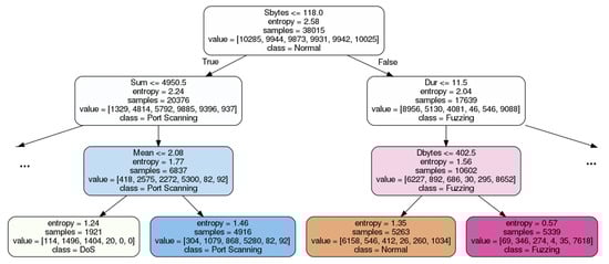 Figure 5 shows a partial view of a decision tree from the random forest constructed for a sample network intrusion detection task on the IoT network dataset that we have generated. As seen in the figure, the entropy of nodes decreases while approaching the leaves, as nodes that are higher up in the tree are split based on a specific threshold of feature values discovered by the algorithm. A random forest contains a multitude of such decision trees, each constructed from a different, randomly sampled subset of the whole training data.