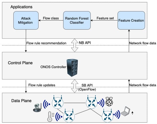 With the increasing adoption of SDN-based network architectures in the past decade, SDN security has become one of the centers of attention for the cyber security research community. The majority of the solutions that have been proposed for SDN-based networks so far have focused on techniques for the detection and mitigation of denial-of-service (DoS) and distributed denial-of-service (DDoS) attacks. In [8], a semi-supervised model was used to detect DDoS attacks in SDN-based IoT networks. The model achieved above 96% accuracy on the UNB-ISCX dataset and the own dataset of the authors, which only included UDP flooding attacks. In [9], an entropy-based solution was proposed for the detection and mitigation of DoS and DDoS attacks in software-defined IoT networks. The approach achieved high accuracy on the Bot-IoT dataset and the authors’ dataset containing TCP SYN flooding attacks. Yin et al. [10] proposed using cosine similarity of packet_in rates received by the controller and drop packets if a predefined threshold is reached. Their approach only mitigated DDoS attacks. Ahmed and Kim [11] proposed an inter-domain information exchange approach that uses statistics that are collected from switches across different domains to mitigate DDoS attacks. Bhunia and Gurusamy [12] used Support Vector Machine (SVM) in order to detect and mitigate DoS attacks in SDN-based IoT networks. The authors created their own data; however, the dataset is not publicly available. Sharma et al. [13] proposed using deep belief networks to mitigate DDoS attacks in SDN-based cloud IoT. Bull et al. [14] used an SDN gateway to detect and block anomalous flows in IoT networks. Their approach managed to succesfully detect and mitigate TCP and ICMP flooding attacks. In spite of the fact that most of these approaches have accomplished successful detection and mitigation, they only work against DoS and DDoS attacks.