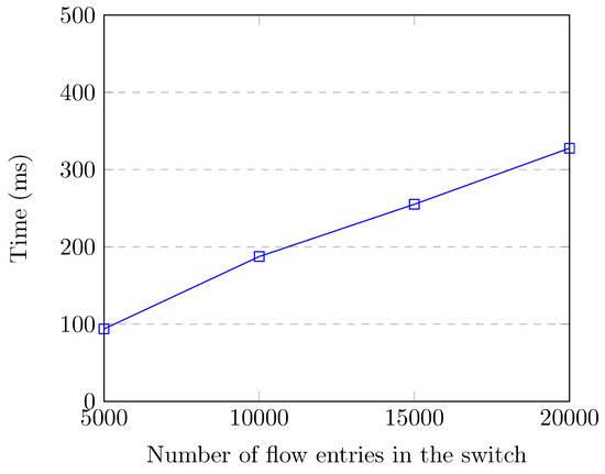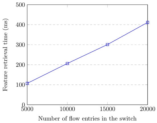 Figure 8 shows the flow entry collection and feature creation time up to 20,000 flow entries in the switch, which corresponds to the attack traffic. Even though there were 20,000 flow entries in the switch, our SDN application collected flow entries and created features for all of the flows in 411.3 milliseconds, which does not cause much overhead for our controller. We observe that the feature retrieval time increases linearly with the number of flow entries in the switch.