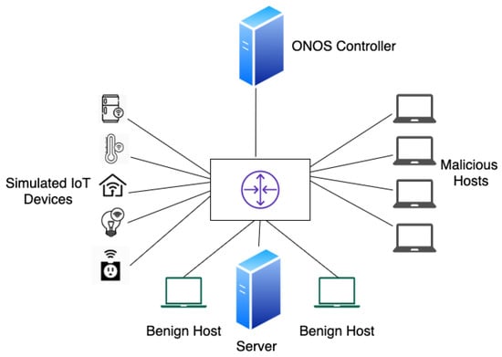 We used a similar network topology to the Bot-IoT dataset [3]. Mininet [38] was used to virtualize our network and an ONOS controller [39] managed the network. An Open vSwitch [40] was used to connect the controller and simulated devices.
