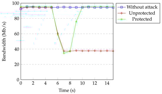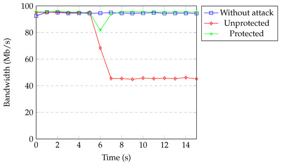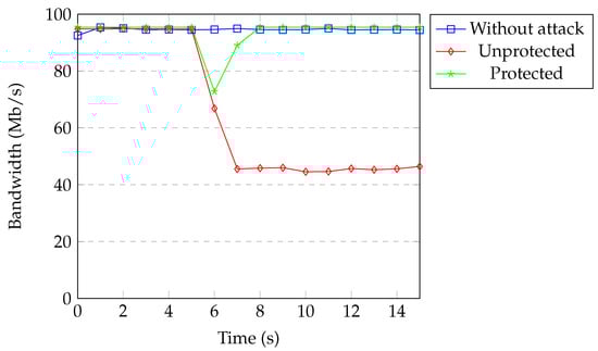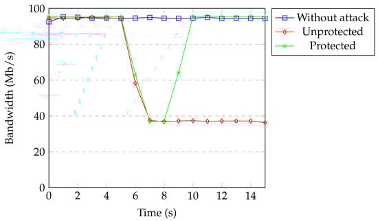 Figure 17 shows the available bandwidth under TCP SYN flood attack without spoofing. All of the packets coming from the attacker passed over the same flow entry in the case of no spoofing. Therefore, it took three detection processes to exceed the threshold. Available bandwidth between one of the IoT devices and the server was around 95 Mb per second during the normal operation of the network. Without protection, the bandwidth decreased to 37 Mb per second. When our protection was active, the attacker was blocked based on the physical port after exceeding the threshold. Bandwidth returned back to normal after a couple of seconds.