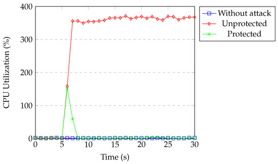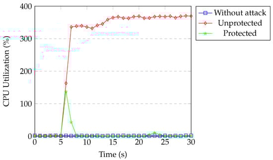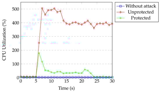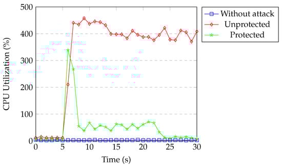 Figure 21 shows the CPU usage of the controller under TCP SYN flood attack. CPU usage was around 2% for our normal network traffic. During the attack without protection, CPU utilization reached 500% within two seconds and stayed there for 7–8 s. Subsequently, it dropped to 400%. When our protection was active, CPU utilization reached 180% for a second and then dropped to around 35% for the next 15 s. Afterwards, CPU utilization returned to normal. Even though the attacker was blocked in the first detection process, attack flows were installed into the switch until the controller installed the block rule. Our classification model kept classifying them in the following detection processes until these flow entries timed out. This is the reason why CPU utilization remained around 35% for a short time.