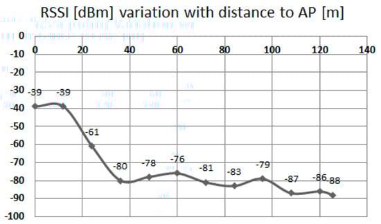 RSSI also does not vary linearly with distance—Figure 1. Moreover, if the purpose of the application is to be used in public transportation traceability of travelers, propagation conditions may vary significantly. Therefore, the purpose of this application is not to precisely pinpoint a specific mobile target, but instead to obtain additional information sets from this technique, namely: analysis of density of mobile targets in a specific designated area, trajectory analysis of a mobile station, memorization of a specific configuration of fixed stations for improving location accuracy in public transportation etc.