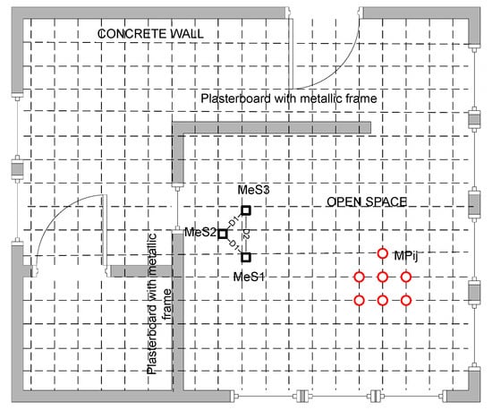 For setting up the indoor testing conditions, a laboratory in the University Politehnica of Bucharest has been prepared, by marking around measurement positions (MPij) separated 1 m each other and placing close to the center of the room three measurement stations (MeS1–MeS3). The configuration chosen for these measurement stations has been previously analyzed and proposed in a Patent (mentioned at the end of this paperwork), with the purpose to be used in a public transportation vehicle, for determining several parameters, among which: An estimation of the number of travelers carried, estimation of the travelers waiting in stations, and private traffic vehicles flowing. This is not subject of the current paper, but because some results were obtained along with experience from this previous process, we have employed the same configuration. In the laboratory, the interior of the room where tests have been performed is separated by a simple plasterboard wall with a window, containing a metallic structural frame.