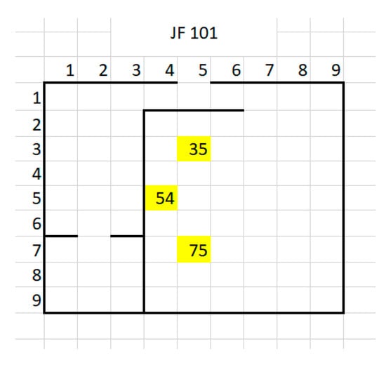 A more schematic representation of the positions where measurement stations were placed (75, 54 and 35 are the marked positions of MeS1 to MeS3).