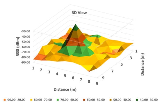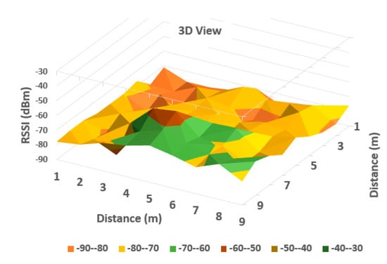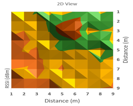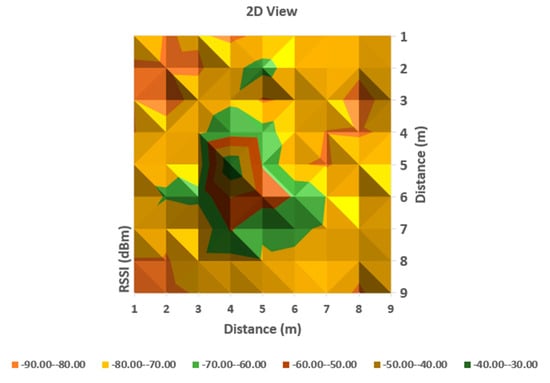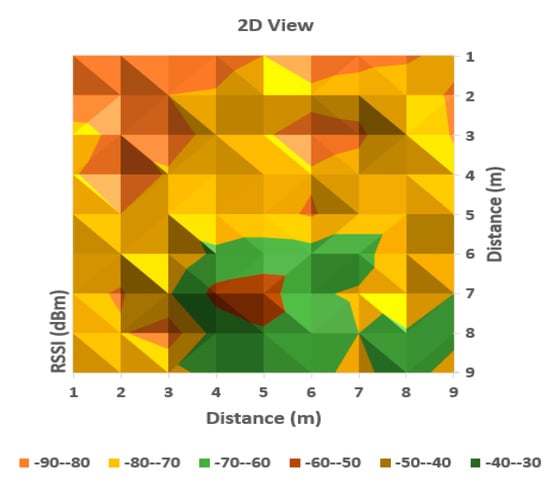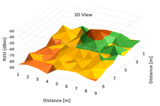 It can be observed from Table 1 that the averaged read values of RSSI vary between neighboring cells in a certain amount, but in general, the loss of signal power can be observed according to distance between the communicating devices. For a more obvious highlighting of how the signal behaves, a 2D representation is presented in Figure 6 and Figure 7 below—histogram with different colors allocated to RSSI levels (color codification shown in the bottom of the image).