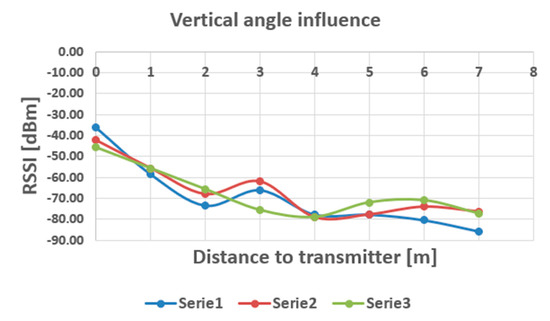 Influence of vertical position on the RSSI readings (Serie 1—V = 0o, Serie 2—V = 45o, Serie 3—V = 90o).